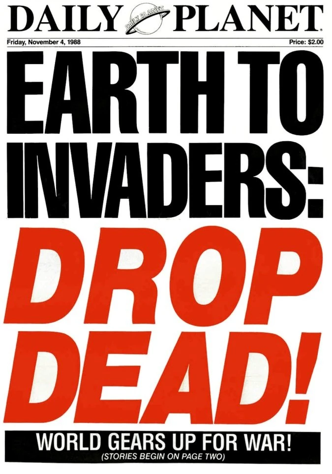 - The Daily Planet's headline, "Earth to Invaders: DROP DEAD!", was a reference to the October 30, 1975 issue of the New York Daily News, whose headline reads, "FORD TO CITY: DROP DEAD".