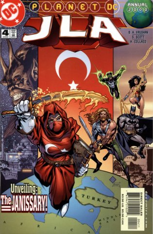Suddenly, a large fiery Jinn appear in each major city in Turkey, bringing with them hordes of undead Ottoman soldiers. Not only does the Janissary, armed with a sword and a book of spells, intervene, but so does the JLA - Aquaman, Batman, Green Lantern and Wonder Woman acting as field troops, with the Martian Manhunter coordinating from the JLA Watchtower.