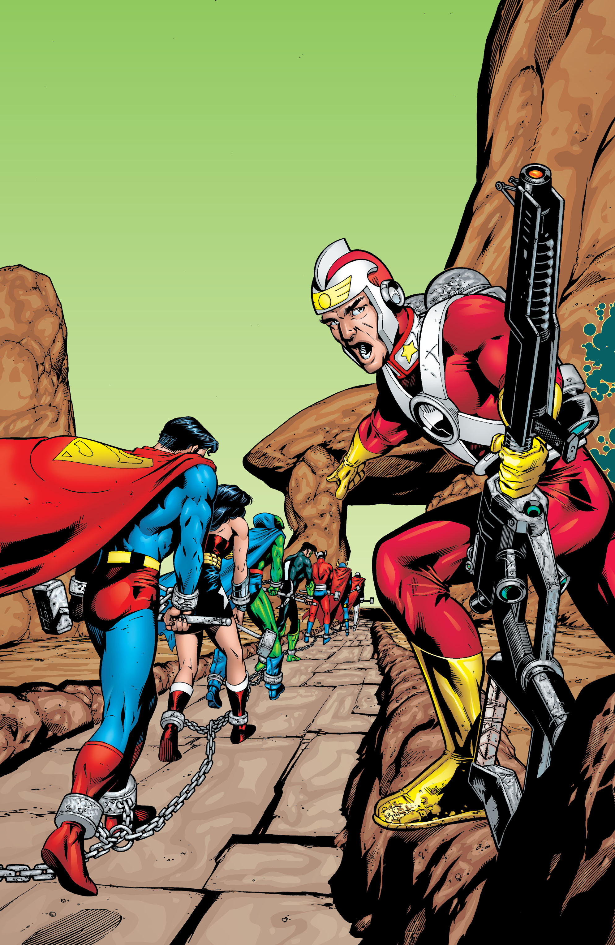 Orion and Barda are exploring the Watchtower's trophy room. When Orion examines a confiscated weapon, while ignoring Green Lantern's warnings, he accidentally fires it. Fortunately, the projectile is caught by Superman, who is now back in his more recognizable uniform follow his battle with the Millennium Giants which dispersed his electromagnetic energy. As the Leaguers talk over Superman and Barda and Orion's accommodations, they are suddenly teleported off the Watchtower and are in chains, which keeps their powers inactive. Their captor is Adam Strange, the defender of Rann and is apparently insane. Adam explains to the Leaguers that they are taken away from their Watchtower by Zeta-Beam and are pressed into slavery into rebuilding Rann, which has been left a wasteland, to prepare for the return of his wife Alanna, who previously to have died from giving birth to their daughter. Furthermore, he has enlisted the En'Taran slavers for help enslaving the Rannians and the Leaguers, whose energy chains keeps their powers in check. Initially the Leaguers believe that Strange is likely brainwashed by the En'Tarans, but the Martian Manhunter looked into Strange's minds and confirms that he is indeed insane. However, J'onn doubted that the En'Taran are capable of mental control as they wouldn't bother to be using shackles. The League decide to humor Strange and the En'Tarans until they find a way to escape.