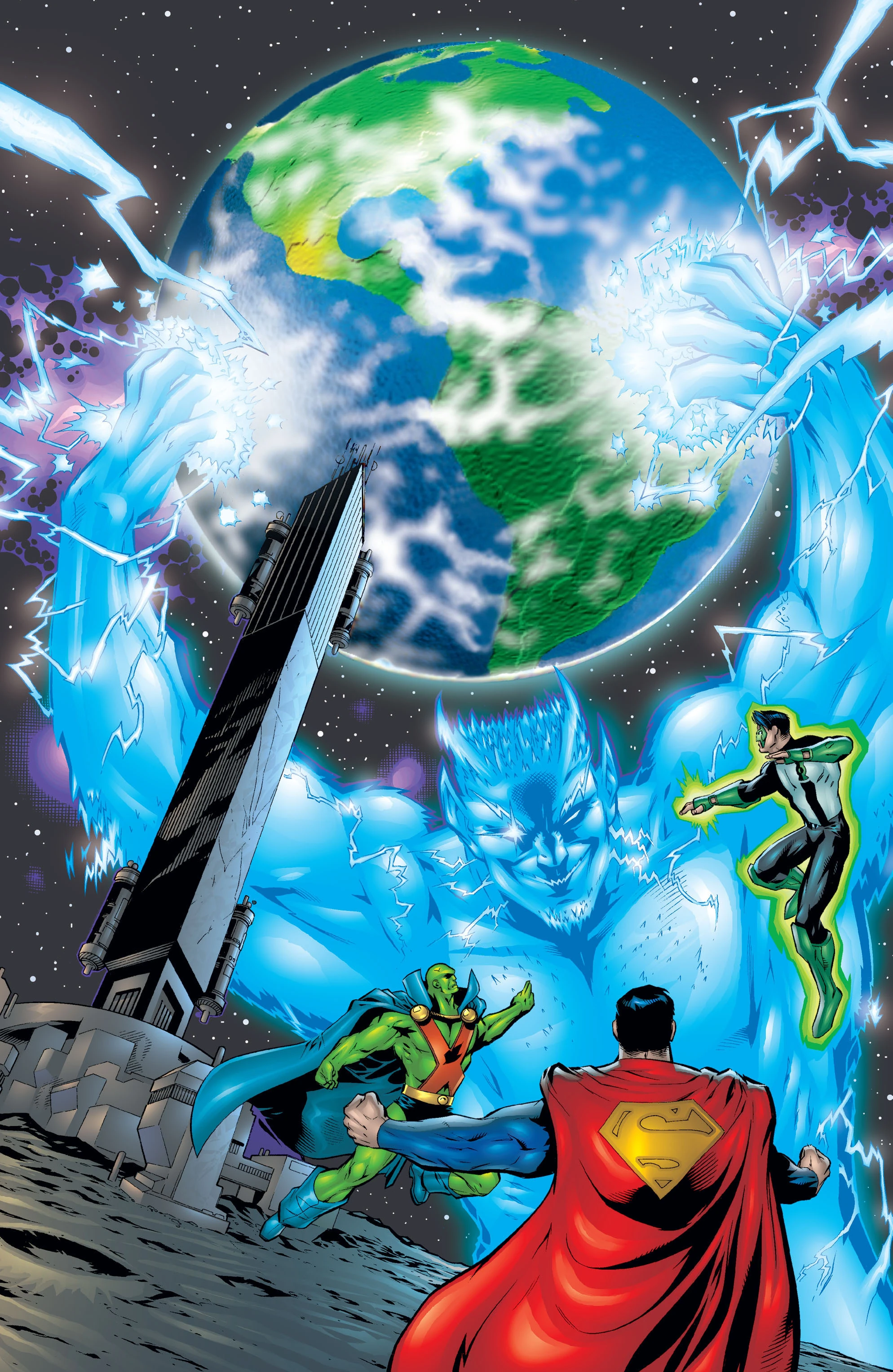 On the moon, Superman wakes up and fights Triumph. Steel has adapted the watchtower to become his armor and uses it to aid Superman in defeating Triumph. The Spectre arrives and freezes Triumph solid. Now he wants to kill Triumph but Zauriel stops him. Instead Triumph will be put into the JLA trophy room.