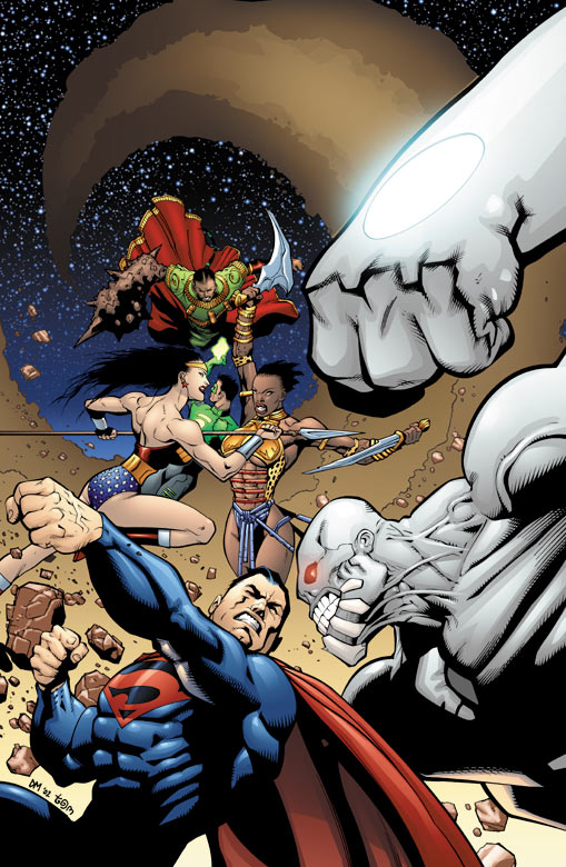 In Atlantis, Wonder Woman has fought her way to the Flash, who says he doesn't know what happened to Batman. Sela stabs Wonder Woman in the shoulder from behind. Meanwhile, enraged by his opponent's tactics, Plastic Man swallows Rama Khan and suffocates him, to the shock of his teammates. However, the most puzzling response is Gamemnae's: despite having a clear shot at Plastic Man, she waits a few seconds before attacking him. She turns Plastic Man to stone and Tezumak shatters him. At that tine, the Anointed One, having chased Superman all around the world, slams him into an Atlantean plaza at full speed. Superman is dead.