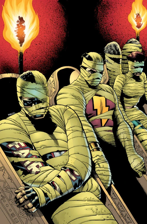 Mister Terrific (Michael Holt), Hawkgirl, and Captain Marvel have been transported back in time to 15th Dynasty Egypt, where they face Vandal Savage from five-thousand years ago. He has found the Orb of Ra and has used it to conjure Ahk-Ton and start a war against Prince Khufu. Mister Terrific (Michael Holt), Hawkgirl, and Captain Marvel ally themselves with Prince Khufu, Nabu, Chay-Ara, and Teth-Adam in the fight against Vandal Savage. Nabu sends Captain Marvel and Teth-Adam to the Land of the Dead to call upon the great sun-god Ra for help, and not even Ahk-Ton and Vandal Savage can stand up to a god. Unable to return home, the heroes turn to Nabu for help. The only solution that he can offer is that they go to sleep in a chrysalis, and have an undying wake them up. Black Adam wakes them up in present time, and they re-join their friends in the Justice Society of America. Meanwhile, Doctor Fate returns to Lyta in the hospital with the skull of Lord Wrynn, a former ally of Mordru. He uses the skull to lift the veil of sleep that Mordru has cast only to discover that it is not his wife, but actually a magically-concealed Dove (Dawn Granger)!