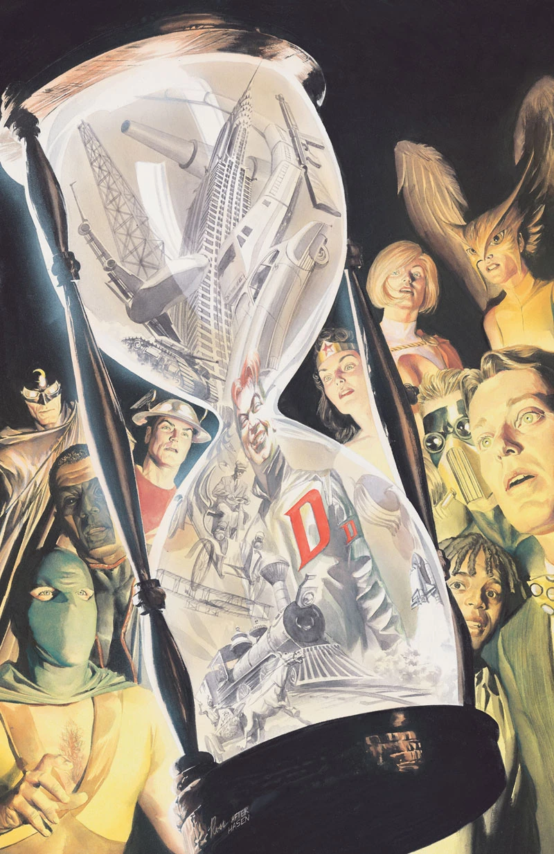 On October 30, 1951, Per Degaton has traveled through time to assassinate Harry S Truman and frame the Justice Society. Time-traveling members of the present-day JSA have teamed with the originals to stop him. The JSAs arrive at the White House at the same time as Degaton's Red Morgue army and they battle. Degaton uses a Time Disc to accelerate The Atom's metabolism, turning him into a human nuclear meltdown. Only Hourman can directly interact with the villain who exist slightly outside of time due to the Tachyon Hourglass that he carries. He gives the device to Atom-Smasher so he can attack Degaton.