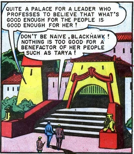 In the early 1950s, an evil seductress backed by two world powers, calling herself Tarya, deposed and imprisoned the old national leader, Gandor Ras, and became the new ruler of Jinnestan. She then ordered her air force to conduct bombing raids against the civilian population of neighboring Khartoor. An impenetrable jungle, between the two nations, precluded a land invasion, but the air raids were devastating. The new king of Khartoor, son of an old friend of the world-famous Blackhawks, called on them for help, and they soon arrived. The Jinnestani Air Force's propeller-driven bombers were no match at all for the Blackhawks' F-90B fighters, and several were destroyed before the survivors fled. Pursuing them into Jinnestani airspace, Blackhawk's own jet was shot down by ground fire, and he was captured. His interview with Tarya went badly; Blackhawk was shot in the shoulder and imprisoned. While in this prison, for several days, Blackhawk tunneled out of his own cell, found Gandor Ras, freed him, and they escaped into the capital city of Jinnestan.