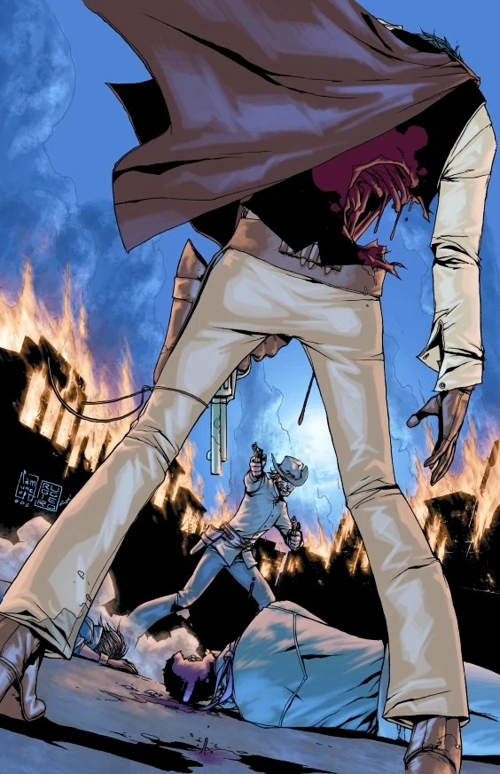 The town of Blood Creek, Texas is aflame. Jonah Hex stands against seven men. He kills six of them before his bullets run out.
