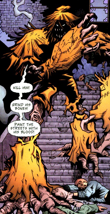 Scarecrow provided them with several of his costumes and he commanded them to spread across Gotham and release his fear toxin in crowded places, which caused mass hysteria. His ultimate plan was to take control over the entire population of Gotham while the city was crippled with fear.[15] Scarecrow almost succeeded, but he was found by Batman and Anarky. Despite his efforts against them, Scarecrow was stopped for good and he was carried to the authorities by Batman.[16]