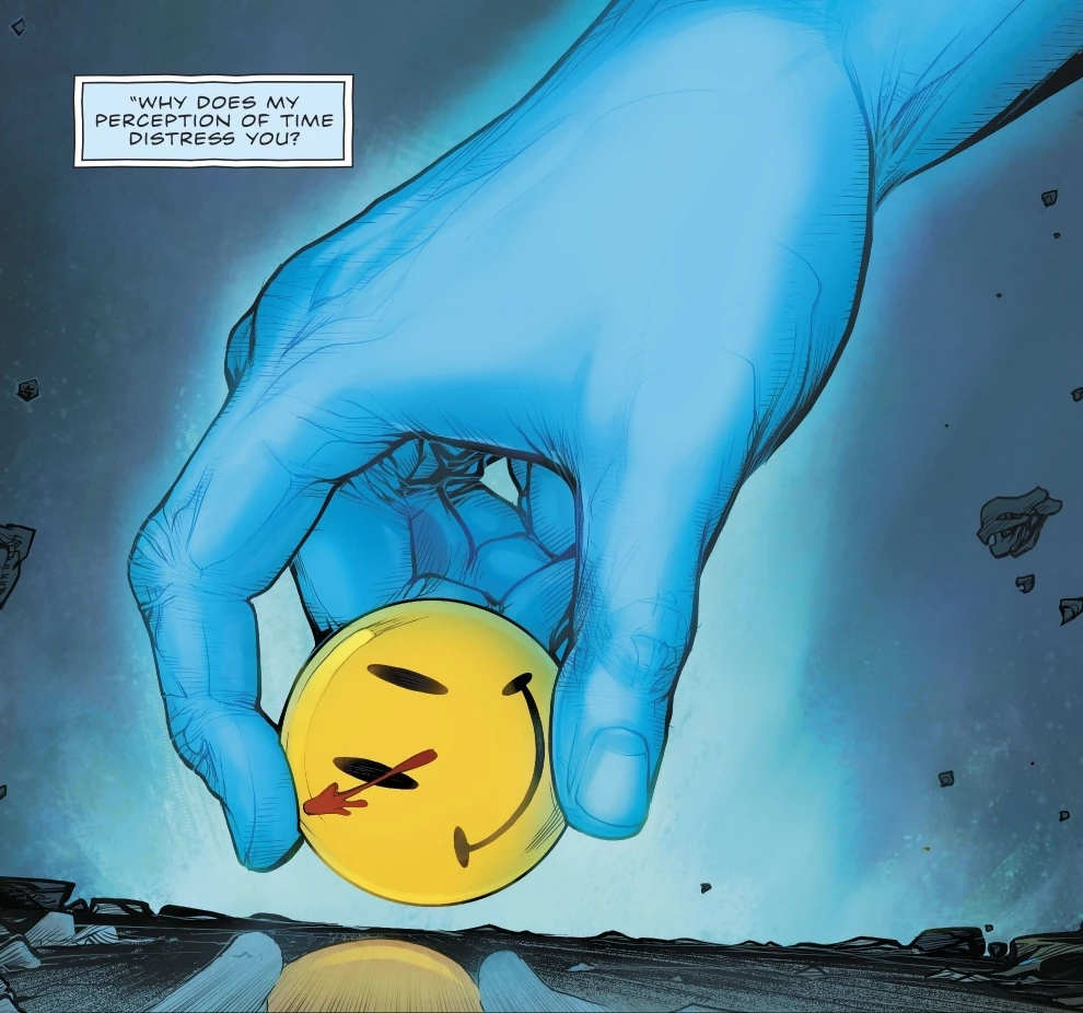 When the Comedian's button appeared in the Batcave after Wally West returned to the timeline, Reverse-Flash attacked Batman in the cave and took the button. Using it as a beacon, the Reverse-Flash set out through the timestream to find its owner. After finally tracing it to a location, he sensed Jon's power upon arrival, demanding him to reveal himself. Jon then did so, frightening Reverse-Flash to the point of begging for his life. Jon then partially incinerated Thawne and transported him back to the Batcave with half his body reduced to burnt muscle and bone. Just before dying, Thawne exclaimed that he saw "God". Jon then retrieved the button from the ground where it had fallen.[8]