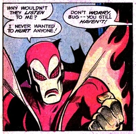 Firebug reappeared some time later, taking on a mission from the Calculator to invade Hero Hotline's HQ, but was disarmed and defeated by the Hotline members.[2] Still later, Firebug applied for membership in Black Mask's gang, but was beaten by his rival arsonist, Firefly. He subsequently attempted to prove he was a better arsonist, and again appeared to be killed by his own inferno.[3]
