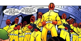 They were imprisoned beneath Bludhaven by O.M.A.C. Units but escaped when the units were shut down. In their first appearance at least four of their members were women but all these members had been replaced with men by the time they were seen again.