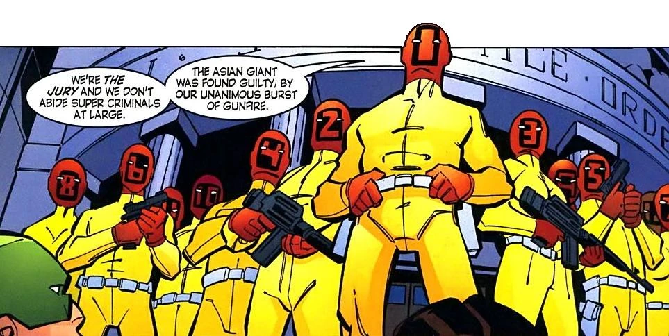 We're The Jury and we don't abide super criminals at large. The Asian giant was found guilty, by our unanimous burst of gunfire. The OMACS seemed to have the same mission, but still took us captive. That's what happens when you give mindless robots a task best performed by "twelve good men and true." Now as to your fate we--