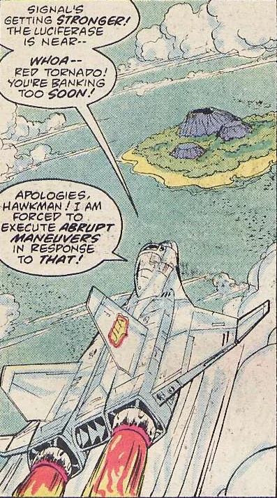 The JLA descends to Lord Claw's island in the Justice League Cruiser