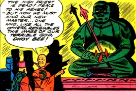 Their relentless search eventually brought them to the United States, and Capitol City, from whence they kidnapped a local taxi operator, one Charles Dickles, who habitually answered to "Doiby", which to the cultists sounded just like "Dhoy Bee". They kidnapped this driver twice, which twice brought them into conflict with the Green Lantern. On their second abduction, however, they painted him green, dressed him up in godly raiment, and hypnotized him into believing that he was Dhoy Bee, new High Priest of Kafoonistan. This delusion persisted even after Dickles was again rescued by Green Lantern. But soon Dickles was hypnotically returned to his normal personality, and the doubly-defeated Sub-Priests complied with Green Lantern's suggestion that they should return to Kafoonistan, and be content to worship Dhoy Bee from afar. They have not been heard from since then.