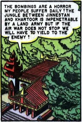 Khartoor was located "not far from the Blackhawk Island base". In the post-World War II era, the tiny nation was still a traditional monarchy, and in 1951 a new king inherited the throne. At this time, the country was under attack by neighboring Jinnestan, a recently-converted Soviet satellite nation. Jinnestani bombers air-raided at will, targeting Khartoori civilians. An impenetrable jungle between the two nations precluded a land invasion, but the air raids were devastating. The new king of Khartoor, son of an old friend of the famous Blackhawk Squadron, called on them for help, and they soon arrived. After great difficulties, the Blackhawks overcame the ruler of Jinnestan, captured her alive, and restored Jinnestan's former ruler, who ordered his military to stand down.