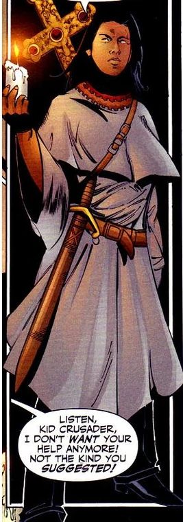 The son of a pair of missionaries who were killed when he was very young, Kid Crusader has sworn to rid the world of demons. Because of this, he was recruited by Deathstroke to eliminate Kid Devil, a task which he approached with great zeal. Though he managed to briefly strip Kid Devil of his powers, he ended up accidentally absorbing those powers - and the darkness they entailed - into himself, which turned him into a demon, and only Kid Devil's assistance restored him to his natural form. His whereabouts since then are unknown.