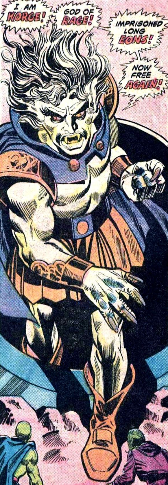 Korge was a self-entitled god who was sealed in a planet which was colonized by Green Martians.