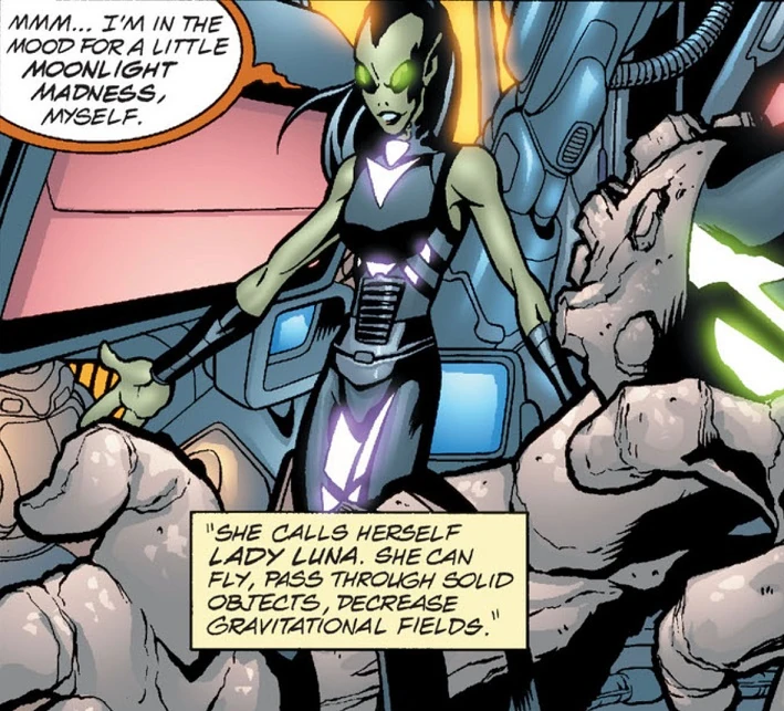 - Gravity Manipulation: Lady Luna can decrease gravitational fields.