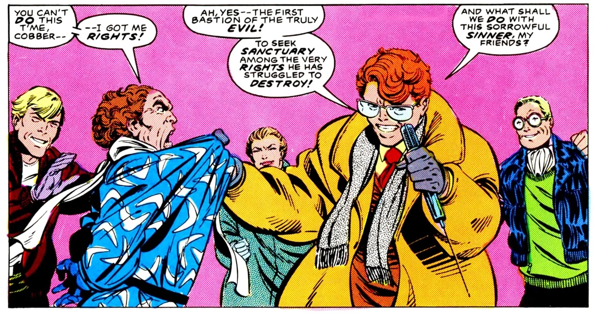 Superman talks to President Reagan in the White House. Godfrey is now actively trying to stage a coup. Reagan remarks that most heroes have disobeyed his edict, excluding Superman. They sent the military to deal with Godfrey, but most of their soldiers defected. Doctor Fate suddenly appears inside the White House. Reagan tells Doctor Fate that he is breaking the law, and Fate responds that he serves a higher authority. Superman is also taken by Doctor Fate.