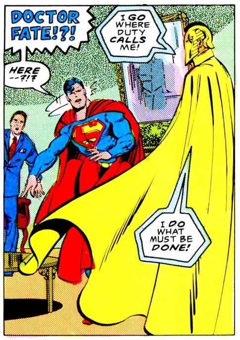 Batman notices that Gotham City is quiet, although he believes that this will not last long. It was easy for G. Gordon Godfrey to turn the public against him, because he has always encouraged people to fear him. However, he knows that somebody who could turn people against Superman must have unnatural powers. Batman knows that he has seen Godfrey before, but can't figure out where. Doctor Fate arrives to summon Batman.