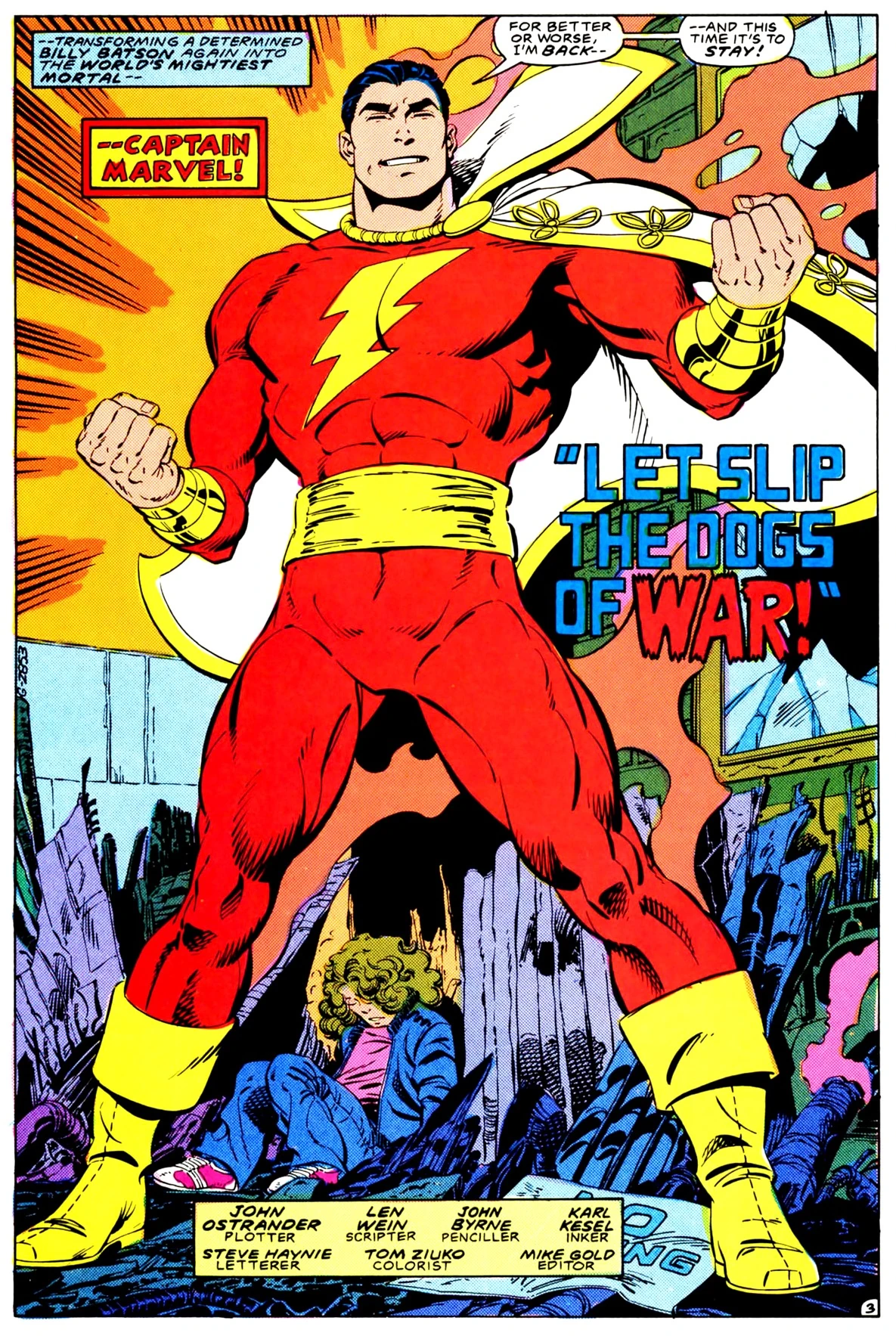 Billy Batson walks through streets that have been devastated by the anti-hero riots. He is still traumatized by the death of Macro-Man, who he falsely believes that he killed. Billy's friend Lisa Sutton catches up to him and tries to comfort him. They see rioters burning an effigy of Superman, and Lisa runs over to argue with these people. Lisa is knocked unconscious by debris, and Billy decides that he must become Captain Marvel again to protect her. The second that he transforms into Captain Marvel, the "wisdom of Solomon" helps him realize that Macro-Man was a setup. Now confident in his own innocence, Captain Marvel tries to disperse the rioters. Time suddenly freezes. Doctor Fate appears and tells Captain Marvel to come with him.