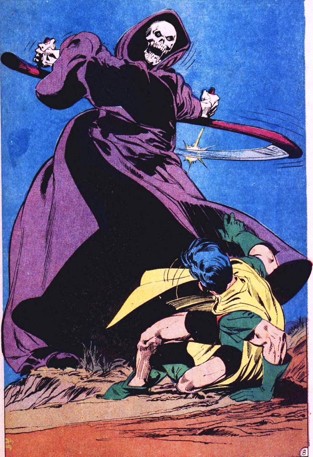 Afterwards, Robin believes that the case is solved, but Batman reminds him that the Reaper is still on the loose and Batman starts looking for the killer by himself. When they finally meet, Batman has deduced the Reaper's identity as Dr. Gruener, who sought revenge on Schloss. Unfortunately, Gruener has lost himself in his Reaper's personality and he attacks Batman before fleeing the scene. The Reaper tries to make his escape through a nearby dam, but he is stopped by the presence of Dick Grayson's friend Alan. When Reaper gets ready to strike and kill the youngster, he sees Alan's Star of David amulet and Gruener becomes horrified with his actions. Unaware that he was walking on the edge of the dam, Gruener stumbles with his robe and falls downwards to his ultimate death and Batman is unable to save the man.