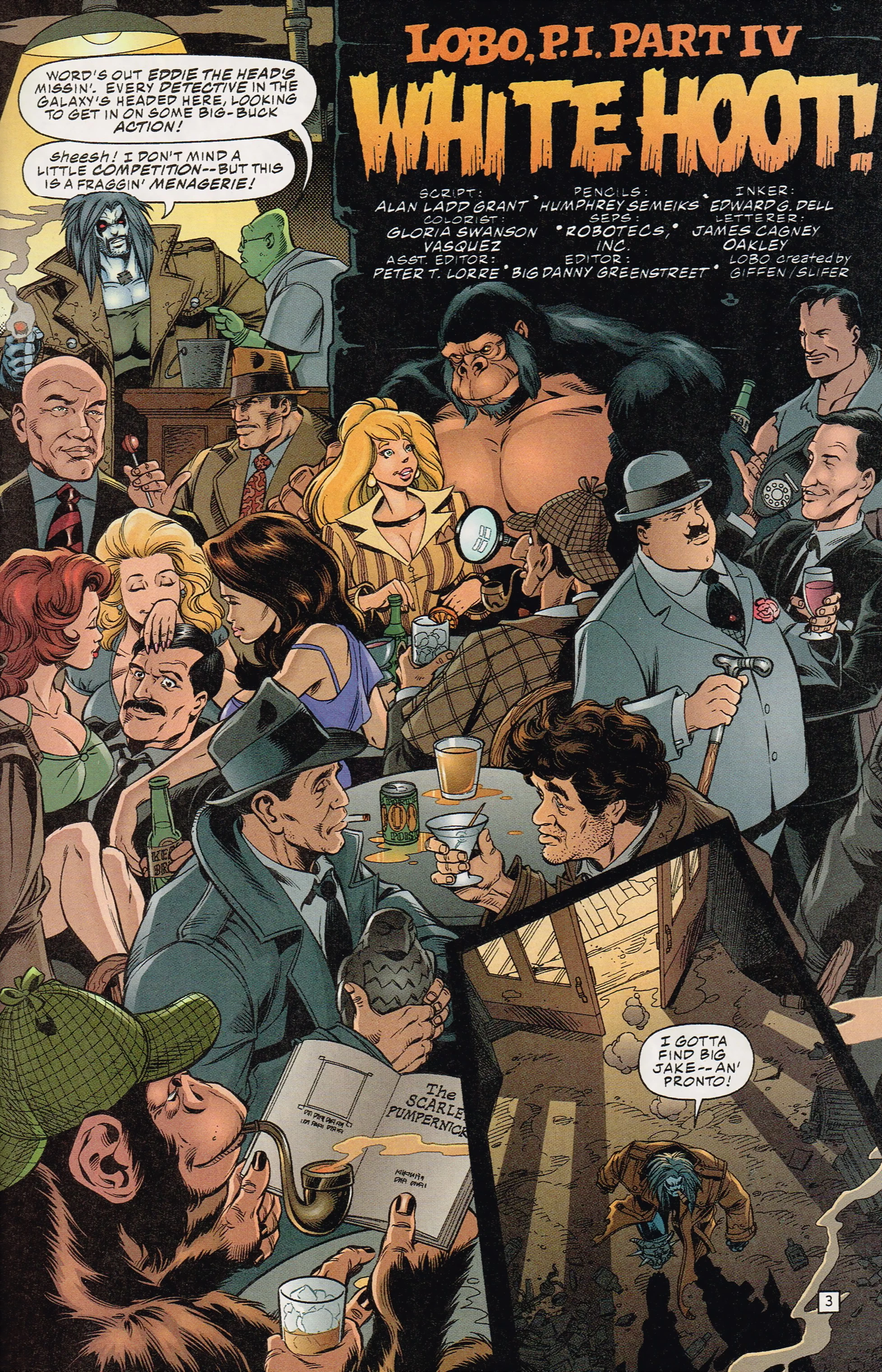 Lobo manages to lunge himself against a wall, shattering his cement overcoat. Still nursing a Mickey Finn induced hangover, he enters the nearest bar, The Gutted Gizz, and orders a bucket-sized Bloody Mary. Feeling himself once more, he asks the barkeep where he might find Big Jake, and the bartender points out the swarm of off-world detectives from all over the galaxy that are looking for the same guy, hoping to score big with Eddie the Head.