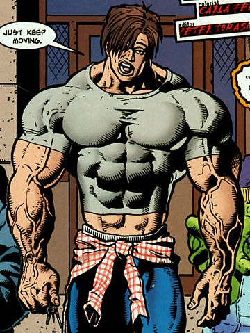 Two alien college students (named Zinnac and Yoof) sent him a package containing an EEM, or Extreme Enhancement Modules, for their thesis on heroes in Earth culture. Lou received the package instead of Martin Lewis, an upwardly mobile young lawyer and philanthropist, because Yoof didn't know that the names are written backwards in the phone book. Lou received a new muscular body that is inhumanly strong and has super-human intelligence. Unlike most superheroes gaining powers were actually an inconvenience to him. Lou's EEM was designed to attract trouble and the other superhumans (who received EEM too) who Martin would have chosen to lead.