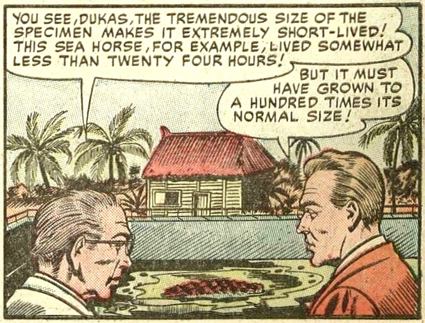 In the early 1950s, on Lubos Island, Professor Jenkins developed a concentrated food formula for marine animals that caused aquatic life forms to grow to 100 times their normal size. The early specimens had very short life spans. Later specimens were more robust, and became a serious problem for maritime commerce. A murderer named Dukas was behind the sea monster attacks. He and his gang were wiped out by the Blackhawks, and the monsters were bombed from the air.