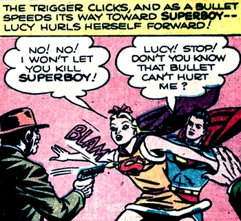 With the help of her handmaiden, Elena, Lucy escaped to America, and enrolled in Smallville High School as "Lucy Regent". Clark Kent was impressed with her, as she was both smart and good at sports. The rest of the kids weren't as pleased. The girls considered her a tomboy, and the boys didn't like she was assertive and eager to learn in classes. Clark befriended her, and after a fight with some crooks, Lucy also met Superboy, and helped him wrap the crooks up. The newspapers ate up the story of the Supergirl, which made its way to Borgonia and Count Norvello.