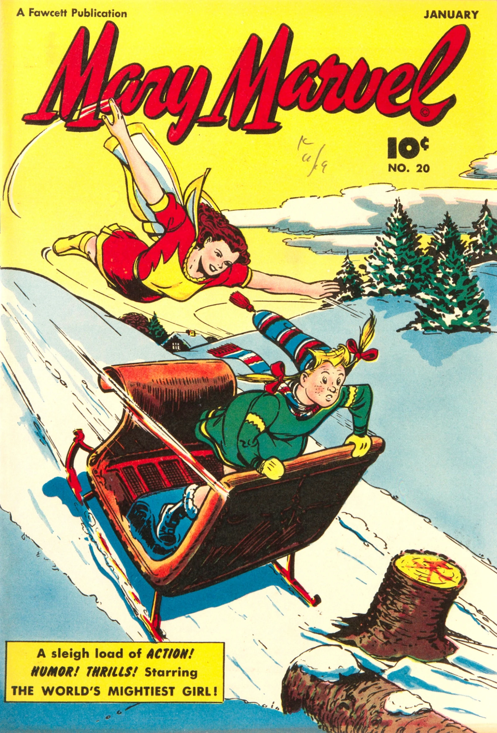 Mary Batson is out with Freckles in Marveltown to celebrate Christmas and puts some mounted reindeer antlers on her old horse Dobbin and they have a fine sleigh ride until the traces break and Dobbin runs off into the snow. Mary calls SHAZAM to become Mary Marvel, but still can't find Dobbin. Mary Marvel flies them through the snow until she finds some hunters trying to take down the “reindeer” in the woods, but she warns them that it's just a horse. She returns with Dobbin to find the sleigh has rolled down a hill, knocking out Freckles and sending the other kids crashing into a tree. Mary Marvel stops them before they hit it and fixes Dobbin back up to the sleigh after she find Freckles in the snow. Mary Marvel decides to just put Dobbin on the sleigh and carries them all back home. Mary Batson later tells Freckles she had a great time and they should do this again.