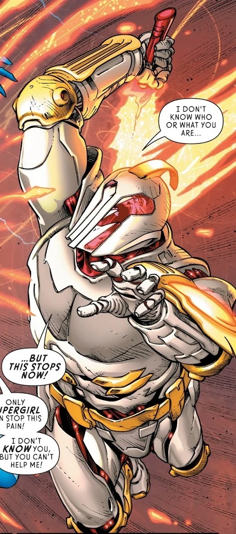Once he was out of jail, Mastrocola decided to put his talents to better uses; so, he built a special armor and adopted the name Insight. In his public debut, Insight tried to stop Strange Visitor's mad rampage. Insight was defeated but saved from Strange Visitor by Supergirl's quick arrival. In the aftermath of the battle, he was captured by the D.E.O. due to Director Bones' insistence on keeping superhumans under control.[4] Nonetheless, Insight allowed himself to be captured. As under custody of the D.E.O., the nanotech in his blood activated and hacked into their systems. When Insight was broken free by Cameron Chase and Lar-On, he transmitted the data he discovered on the DEO's dirty dealings to a database to be spread around.[5]