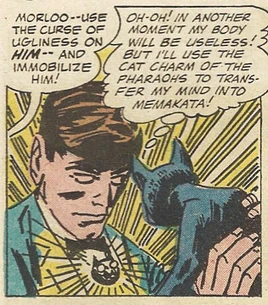 During one of Merlin's earlier adventures, he and his assistant, Elsa, discovered a mystical cat-headed amulet which enabled Merlin to transfer his "life force" into the body of a black cat named Memakata, whom they found in the tomb of the pharaoh of the same name.[1] Memakata became Merlin's household pet and in times of danger, Merlin would "mind hop," between Memakata's body and his own.