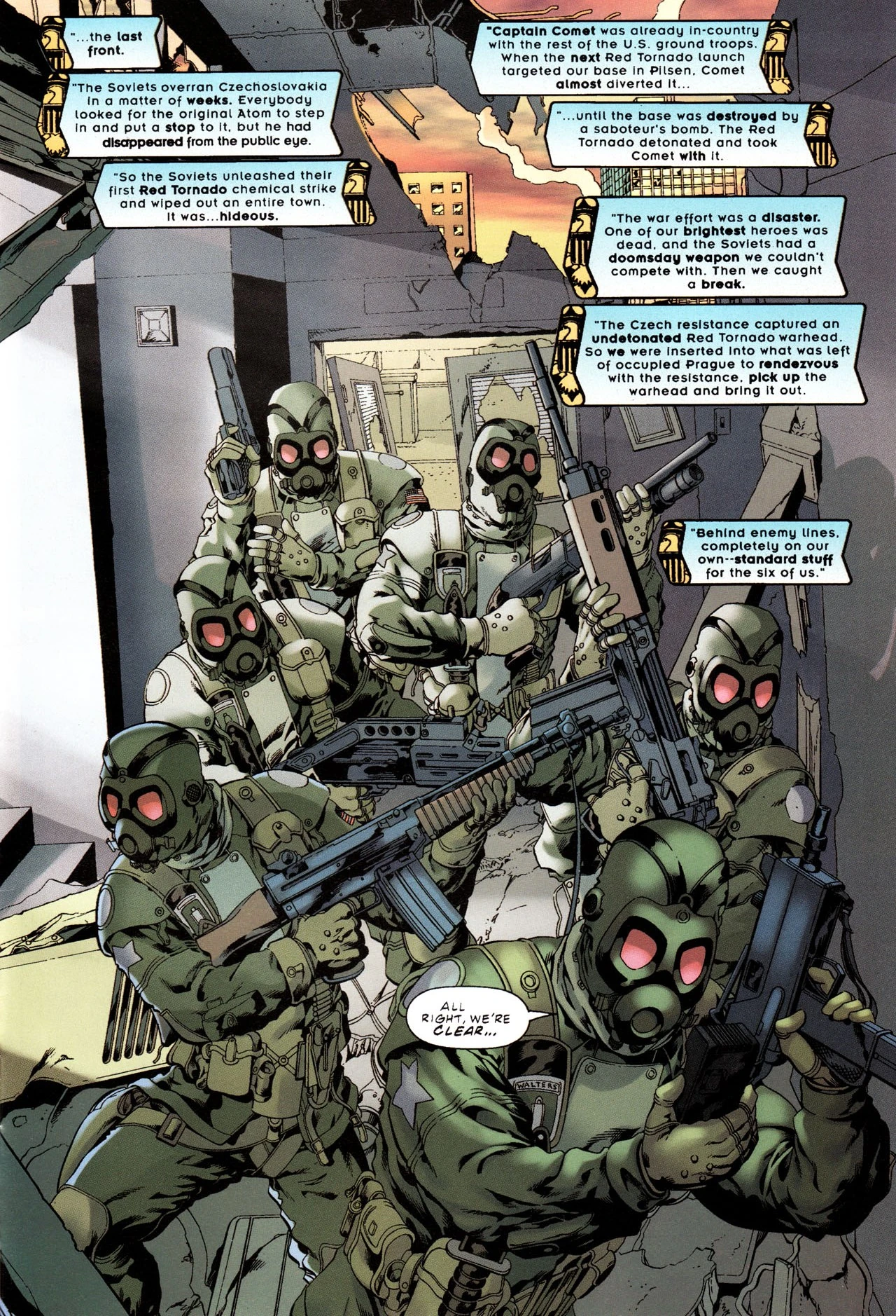 The Metal Men were active during the Czech War of 1968 and were responsible for quickly ending the war by securing the Soviet super weapon, the Red Tornado warhead, for America and used it to broker peace with the Soviet Union. However, this was not without the loss of Marcus Moore, who was killed for attempting to launch the Red Tornado on Moscow.[1] After the end of the war, the Metal Men disbanded and the men went their separate ways.