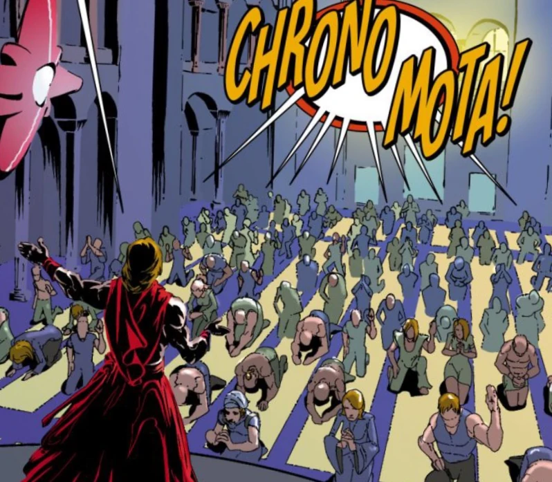 When the present Captain Atom makes contact with future Michael; Michael misrepresents his childhood as selfish, petty, careless - even cruel. Now that he is devoted, Michael is ready to execute Chrono Mota's will, where "we wipe the slate clean" and "release a new genesis" which will destroy Earth.[3] When the true form of Chrono Mota appears, Michael realises that Captain Atom's questioning is a test of his faith. In his renewed religious mania, Michael drops Dr Megala's reconstituted dimension ship (the Orb) down a borehole towards the center of the Earth, with Captain Atom following closely behind.