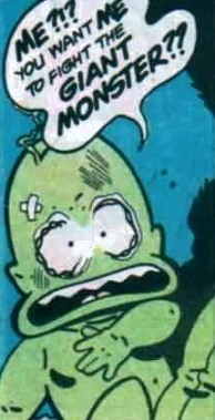 In Son of Ambush Bug # 1, he was given a 4-page story (because Ambush Bug lost his "Villain Permit"). It is revealed that he tricked the government into paying him by hiring him to be the "Official Giant Monster Slayer". However, it turned out there was a giant monster: the Godzilla-like Gogan. When the government refused to allow him to back out, he attempted to confront the monster and was eaten. The reader is then shown four possible outcomes: