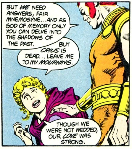 Mnemosyne, the mother of memory, was one of the Titans of Myth and sister-wife of Crius. As such, she has been a supporting character of Donna Troy.