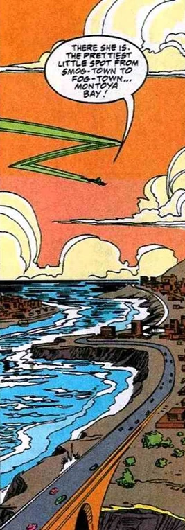 Hal Jordan picked Montoya Bay as the base for his air transport company because it was small and secluded, and had a small airstrip with minimal air traffic, located on an island a little off the coast.