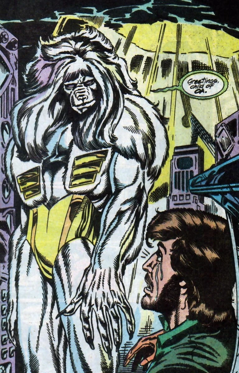 N'Lasa was part of the Manhunters' rebellion against the Guardians. Judged for his crimes, the Guardians bio-engineered him for longevity, and exiled him to Earth. He attempted to destroy the robotic Manhunters, and failed. He created a group of Samurai warriors, the Jujin, who again lost against the Manhunters. N'Lasa was imprisoned and his mind was and body were experimented on by the Manhunters. Linked to a psionic hive mind, he attempted to subvert the indoctrination of several Manhunter recruits, including Dumas, who was a partial success. N'Lasa shows all this to Mark Shaw, before being attacked by the new Dumas.[1] He reveals himself to Shaw after Shaw has defeated Dumas, and gives him a new baton. N'Lasa offers to be Mark's mentor, should he desire it.[2] Mark returns the staff to N'Lasa. N'Lasa declares himself ever in Mark's service.[3] Later, the dying imposter Manhunter mentally sends the baton back to N'Lasa, covered in blood.[4]