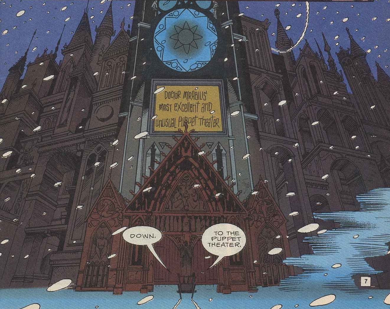 When the puppets order Cliff and the Fifth Window's deaths, Cliff makes a break for it, and rushes up to the belfry of the church in which the puppet theater is housed, leaping onto one of the ropes attached to the bells' pulley system, and causing them to peel out loudly. The sound alerts Josh Clay, in whose snow globe Nürnheim has been hiding. Sure that the source of the danger is inside it, he smashes it on a table, causing Cliff and the Fifth Window to appear in the Doom Patrol Headquarters. Desperately, Cliff warns Josh to finish destroying the snow globe, but the town inside it begins growing and growing until that effort would be useless. That is, until the city simply disappears before their eyes.[1]