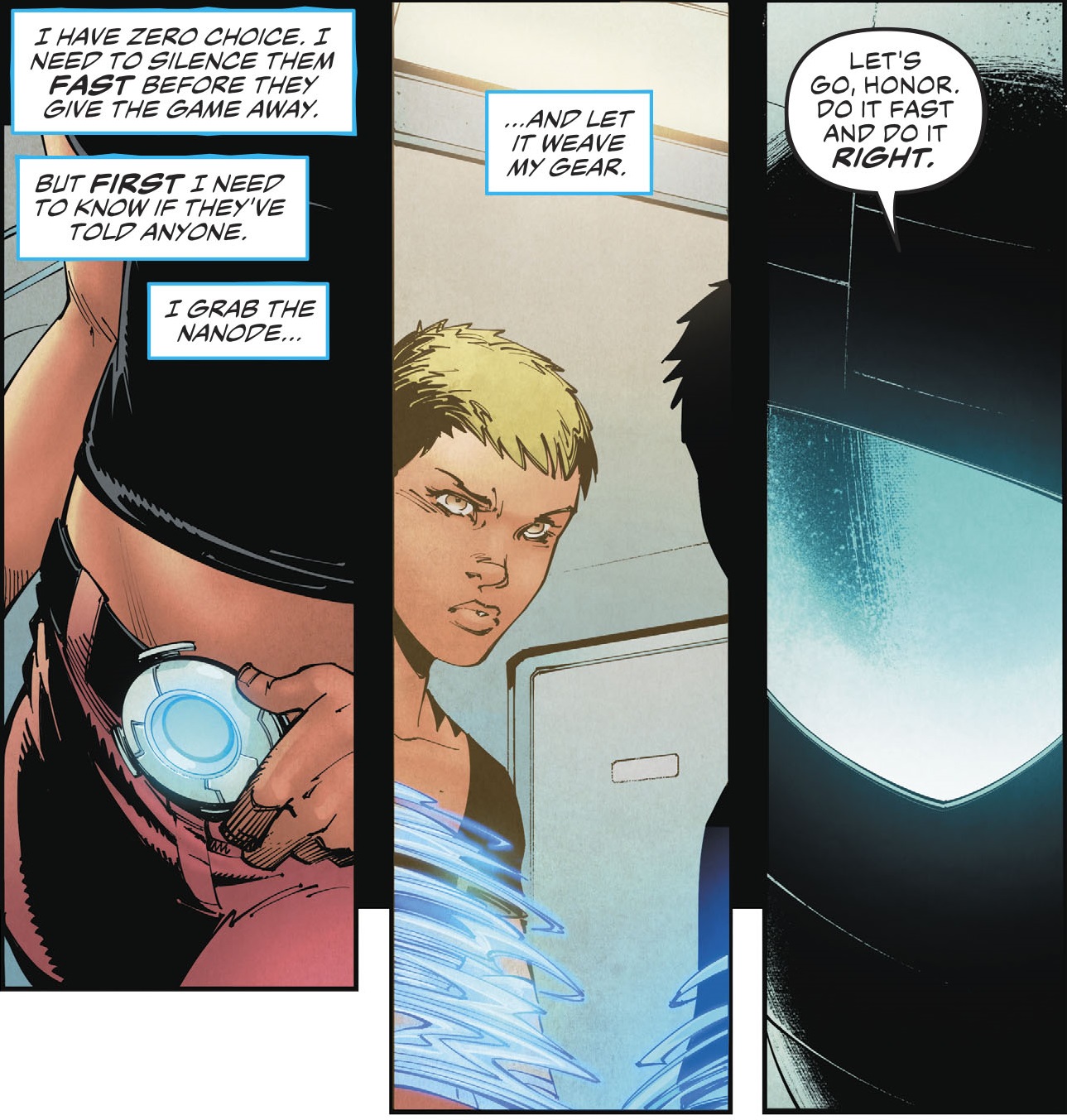 As the war reached a fever pitch, the Nanode's original handler sought out The Silencer to re-arm her former cleaner with said same device they had once wielded in service to the organization. All so as to prep Honor for the upcoming tide from the fallout of its Civil War.[4]
