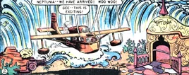 By the late 1940s, Neptunia was entirely submerged, still populated, behind and under giant crystal walls, which change shape as directed. The former ruler had connived his way back into power, and thrown Presidenta Una and her all-girl staff into a dungeon. When Etta Candy and the Holliday Girls traveled to Neptunia, they too were endungeoned. This inevitably led to Wonder Woman returning to Neptunia for a fourth and final conflict with Solo, at the end of which the ex-ruler was again imprisoned, in Neptunia.[2]