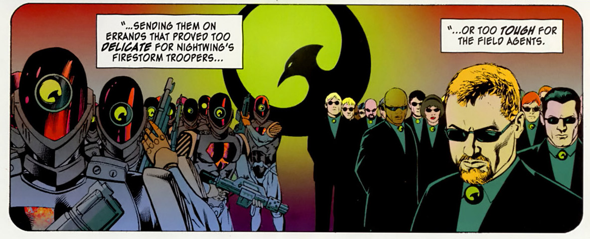 When a sudden wave of costumed heroes appeared in 1996, Nightwing was ready to both monitor and counter their efforts. Nightwing formed a black ops team of magic users called Night Force, which later became a rogue faction opposed to its parent organization. But in reality Nightwing secretly manipulated Night Force to serve their interests by sending them on missions deemed too sensitive for Nightwing's operatives.[2]