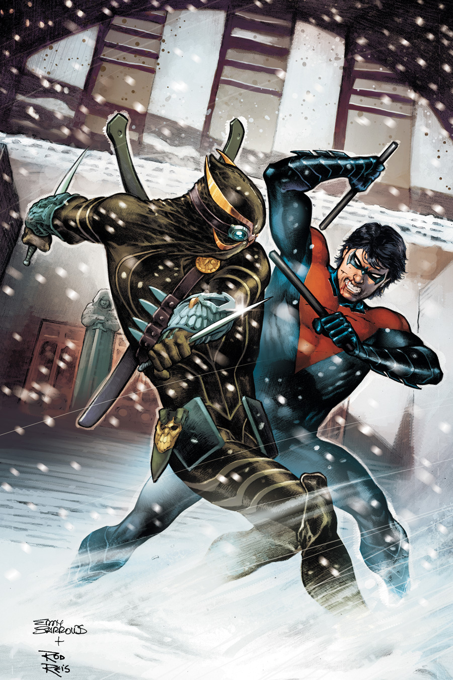 His chest filled with knives, Nightwing is surprised to see that William Cobb has managed to escape the Batcave. Through gritted teeth, he urges Mayor Hady and Thomas Kavanaugh to hide in the vault on the fourth floor, and not come out for anyone. The Talon launches himself at Nightwing, and the two crash through the window of Gotham City Hall. He condemns Dick as a betrayer of his own blood. He challenges his descendant to impress him.