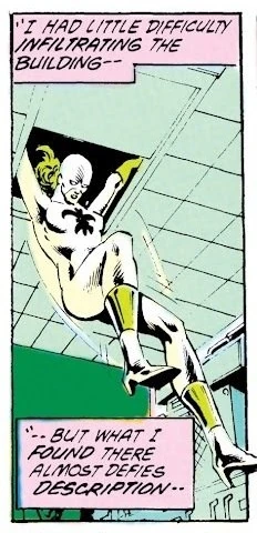 While with the Global Guardians, she was dispatched to shut down Cornelius/Krieg's Research Center No.5, to teach the pharmaceutical company a lesson for kidnapping American chemist Jeremiah Duncan.[1] She managed to rescue him and destroy the research center.[2] At some point, she clashed with French supervillain Warp,[3] had a romantic relationship with Deathstroke, and was briefly a member of the Ultramarine Corps.