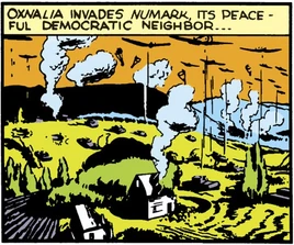 In late 1941, just before the United States entered the Second World War, Oxnalia opportunistically invaded Numark. Acting independently, the American adventurer "Superman" traveled very rapidly to Numark, then to Oxnalia, and intervened. He saved King Boris from an assassination attempt and saved Prince Michael from an airborne kidnapping. Superman went on to overthrow the dictatorship of Razkal, in Oxnalia, and at his urging, the suddenly-leaderless Oxnalian soldiers reached a peace agreement with Numark.