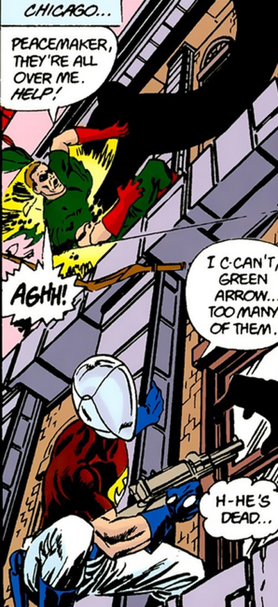 Seeing that the Anti-Monitor was releasing his murderous Shadow Demons to randomly attack and kill people on the resulting single Earth, Queen once again rose up as Green Arrow. But despite Queen's best efforts, Queen's age and his time away from active duty proved to be his downfall as he was no longer swift enough to avoid the Anti-Monitor's Shadow Demons' attacks and was killed in that first battle on New Earth.[8]