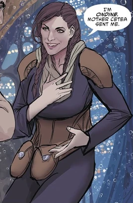 Ondine was sent by Mother Cetea to protect Vulko from Corum Rath's men after he sent word to Mera of Aquaman's survival of the coup. Told that Vulko knew much of the old lore of Atlantis, she aided him in his attempt to get into the royal treasury to secure the Trident of Neptune in an attempt to break through the Crown of Thorns sorcery placed by the Silent School.[1]