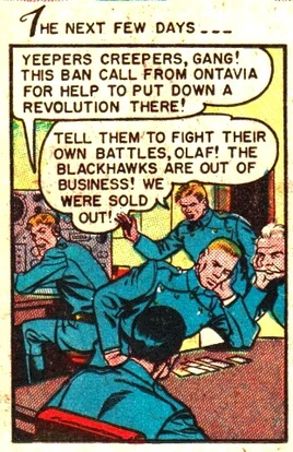 The only known instance of the Blackhawk Squadron ignoring a call for help from a beleaguered government was Ontavia, in 1951, at a time when the team's leader was preoccupied on a case in Ramastan, and the team itself was on the verge of breaking up. Ontavia's government was beset with rebels at that time. That rebellion's outcome is not chronicled, and the nation of Ontavia has been mentioned nowhere since then.[1]