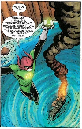Opto309V witnessed a space vessel carrying Adam Strange and Starfire crash land in one of Mogo's lakes. Opto309V contacted John Stewart and helped him return Adam Strange back to Rann.[2]