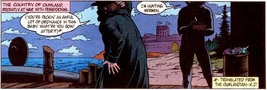 Several years ago, Oumlandian naval vessels violated the twelve-mile restricted area, and Atlantean border patrols opened fire on them. This minor skirmish escalated into an international incident, the result of which was a retaliatory strike against Atlantis' capital city, Poseidonis. Rather than seek redress with the United Nations, Black Manta coerced Oumland's Prime Minister, Stom, to order six nuclear submarines to attack the Atlantean city. The bombardment succeeded in destroying the protective dome covering the city, killing dozens of Atlanteans. Prematurely, Stom then announced Oumland's annexation of the Continent of Atlantis.