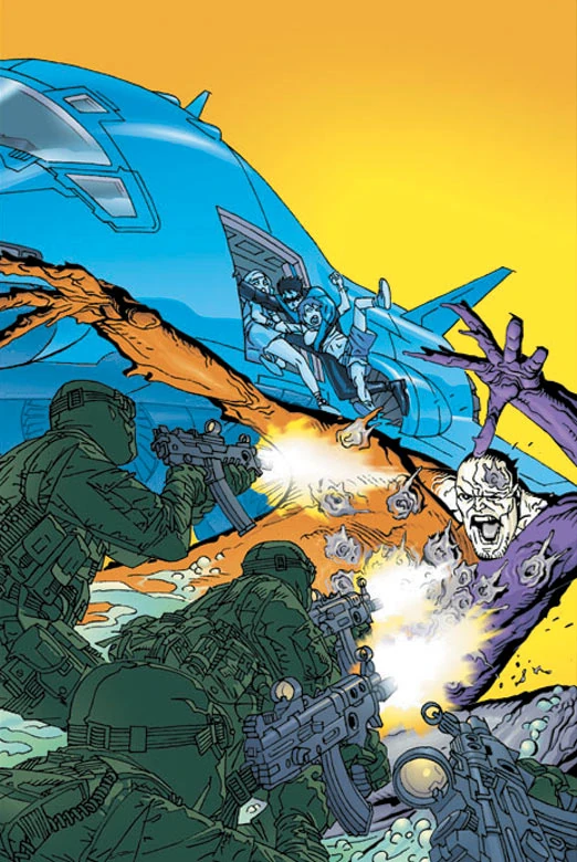 Metamorpho is able to shield Grace and Indigo from the blast that destroys the Church of Blood's base and the monastery that concealed it. Indigo was able to access some of Blood's files and discovers that the Church of Blood has a number of sleeper agents who are to steal newborn infants for the group at a given signal. As they begin to track the agents down, they discover several of them dead, and another, Arthur Donnel, pulls a gun on Arsenal and shoots him in the chest several times.